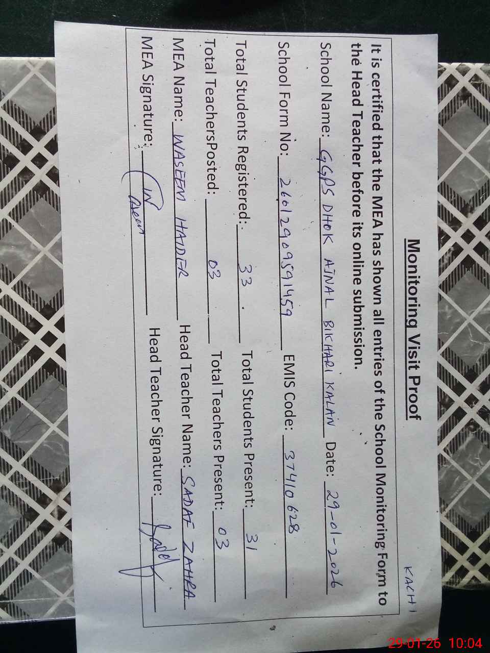 | Attendance Register | Head Teacher | MEA with School | Visit Proof |