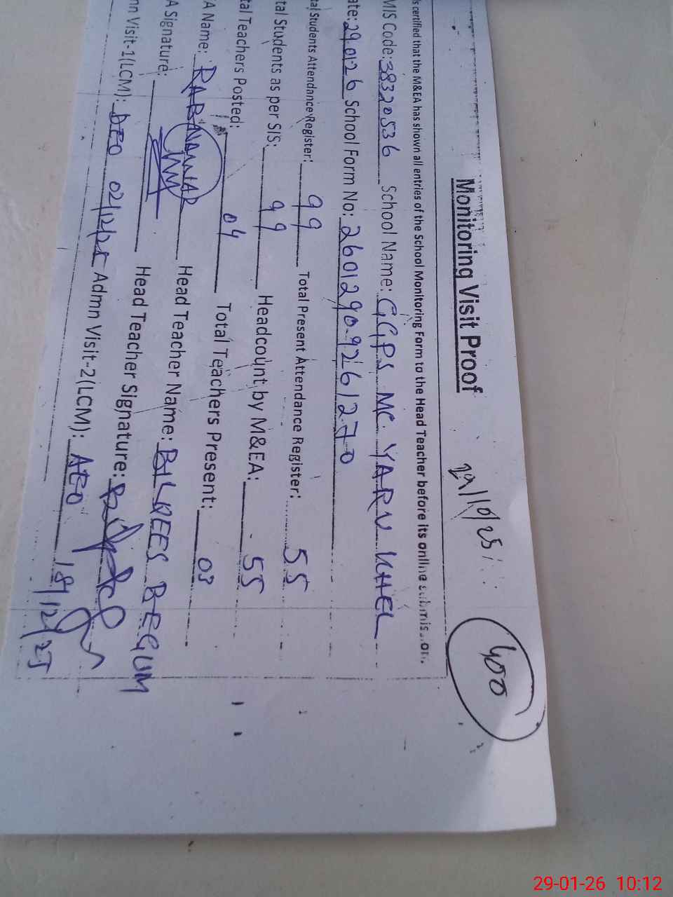 | Attendance Register | Head Teacher | MEA with School | Visit Proof |