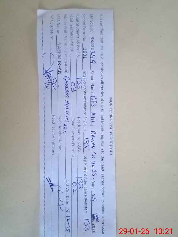 | EMIS Code: 38420258 | Name of School: GPS AHLI RAWAN CHAK NO. 110 SB | |||