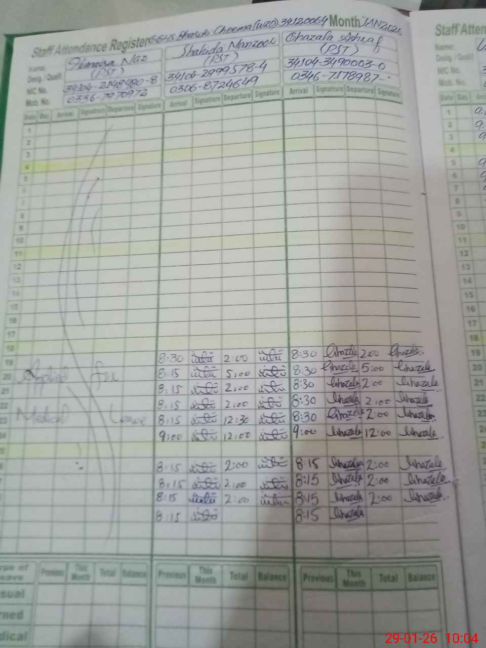 | CNIC | Full Name | Designation | R/C | Absence During Last Calender Month |