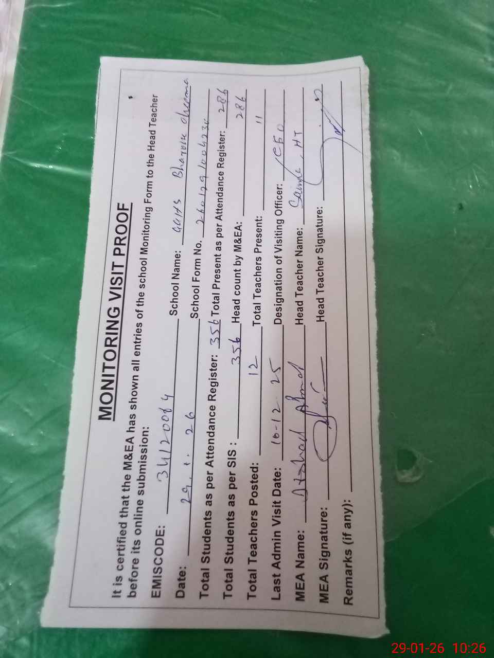 | Attendance Register | Head Teacher | MEA with School | Visit Proof |
