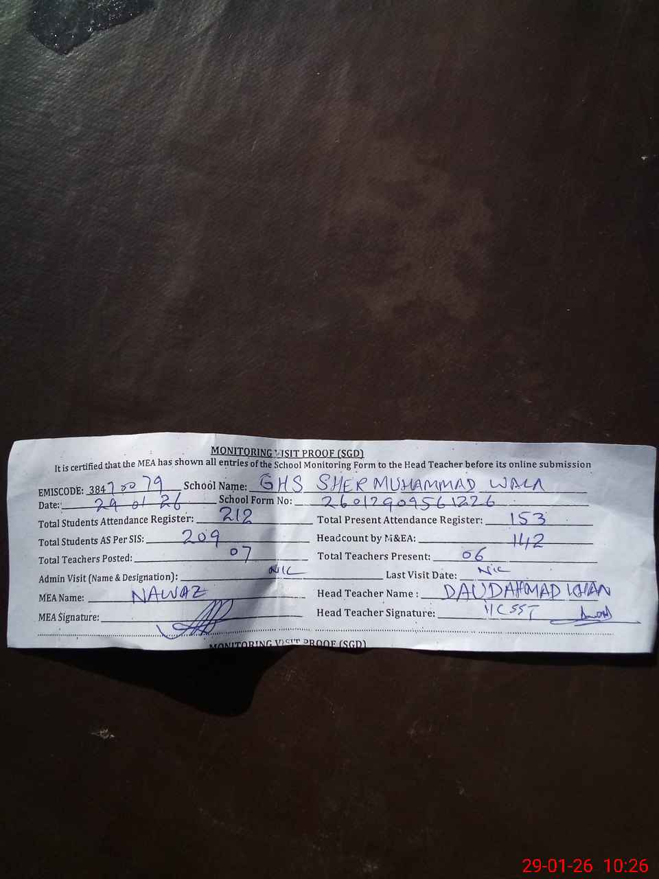 | Attendance Register | Head Teacher | MEA with School | Visit Proof |