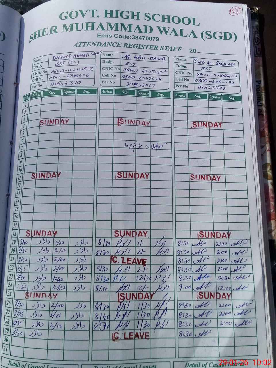 | CNIC | Full Name | Designation | R/C | Absence during last cal. month |
