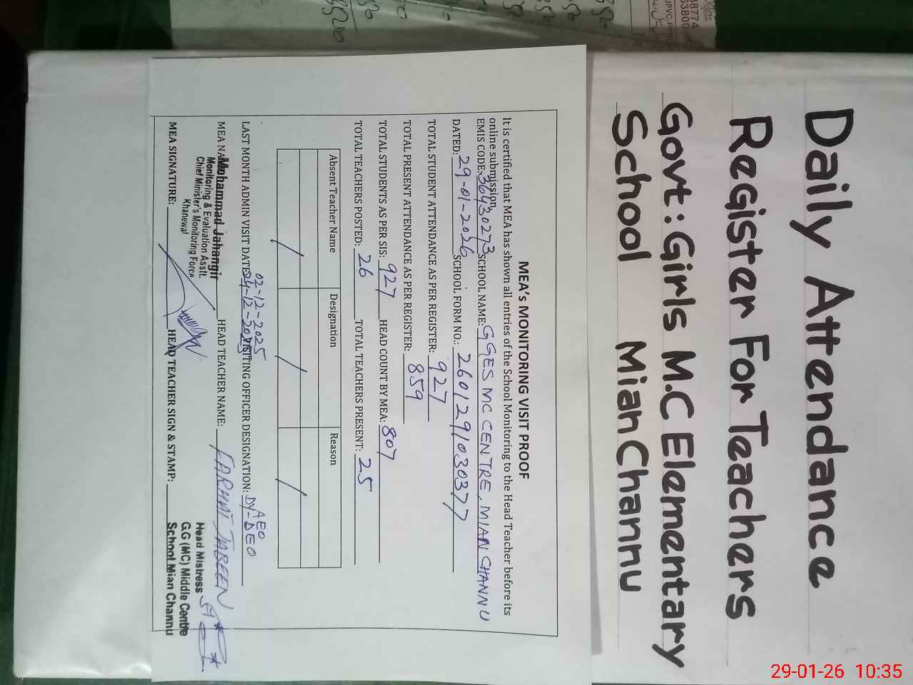 | Attendance Register | Head Teacher | MEA with School | Visit Proof |