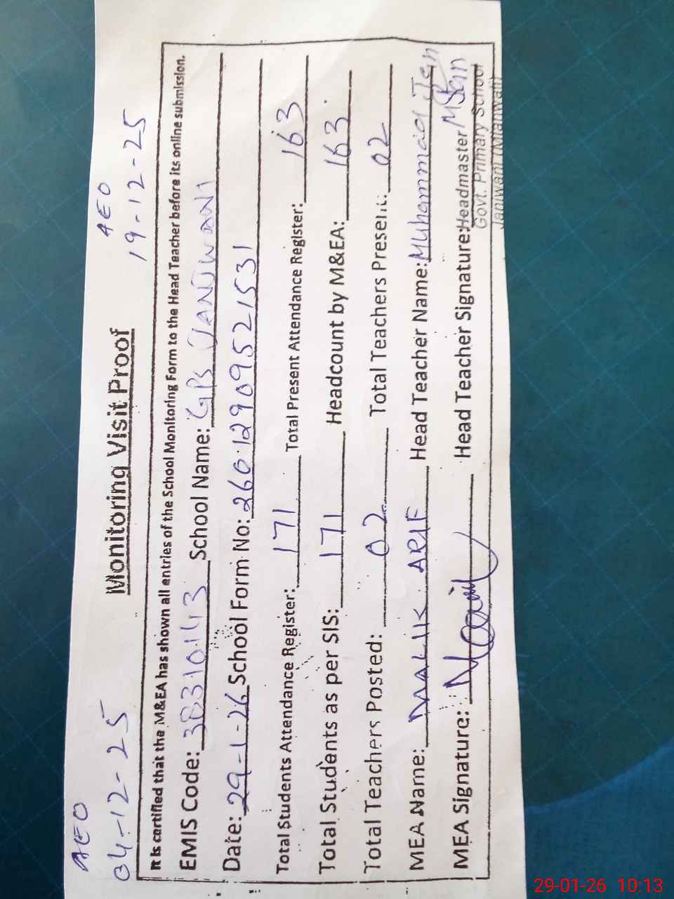 | Attendance Register | Head Teacher | MEA with School | Visit Proof |