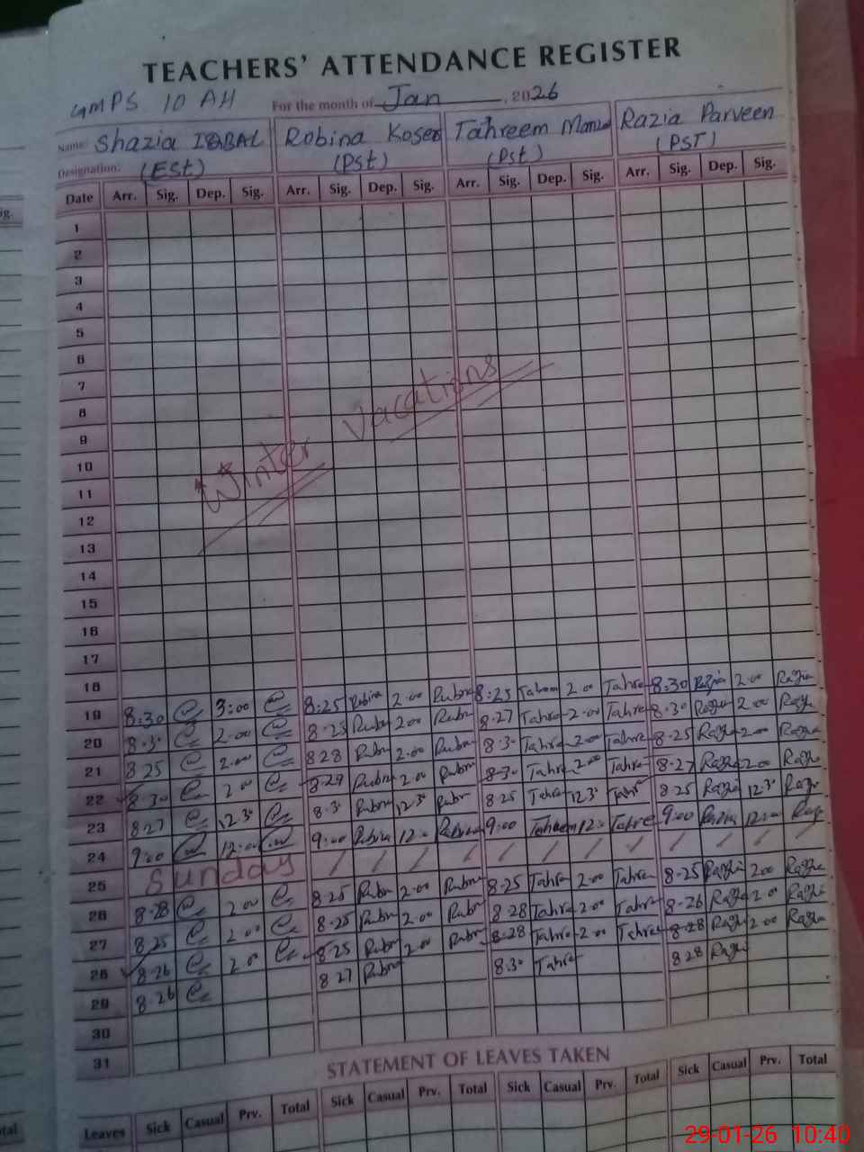 | Leave | Duty | Absent | Maternity | Medical | Ex- Pak |