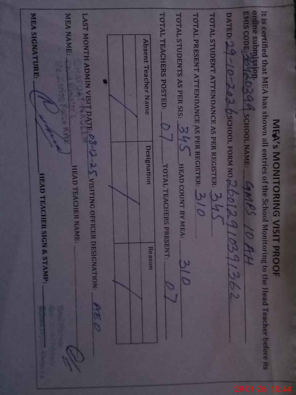 | Attendance Register | Head Teacher | MEA with School | Visit Proof |