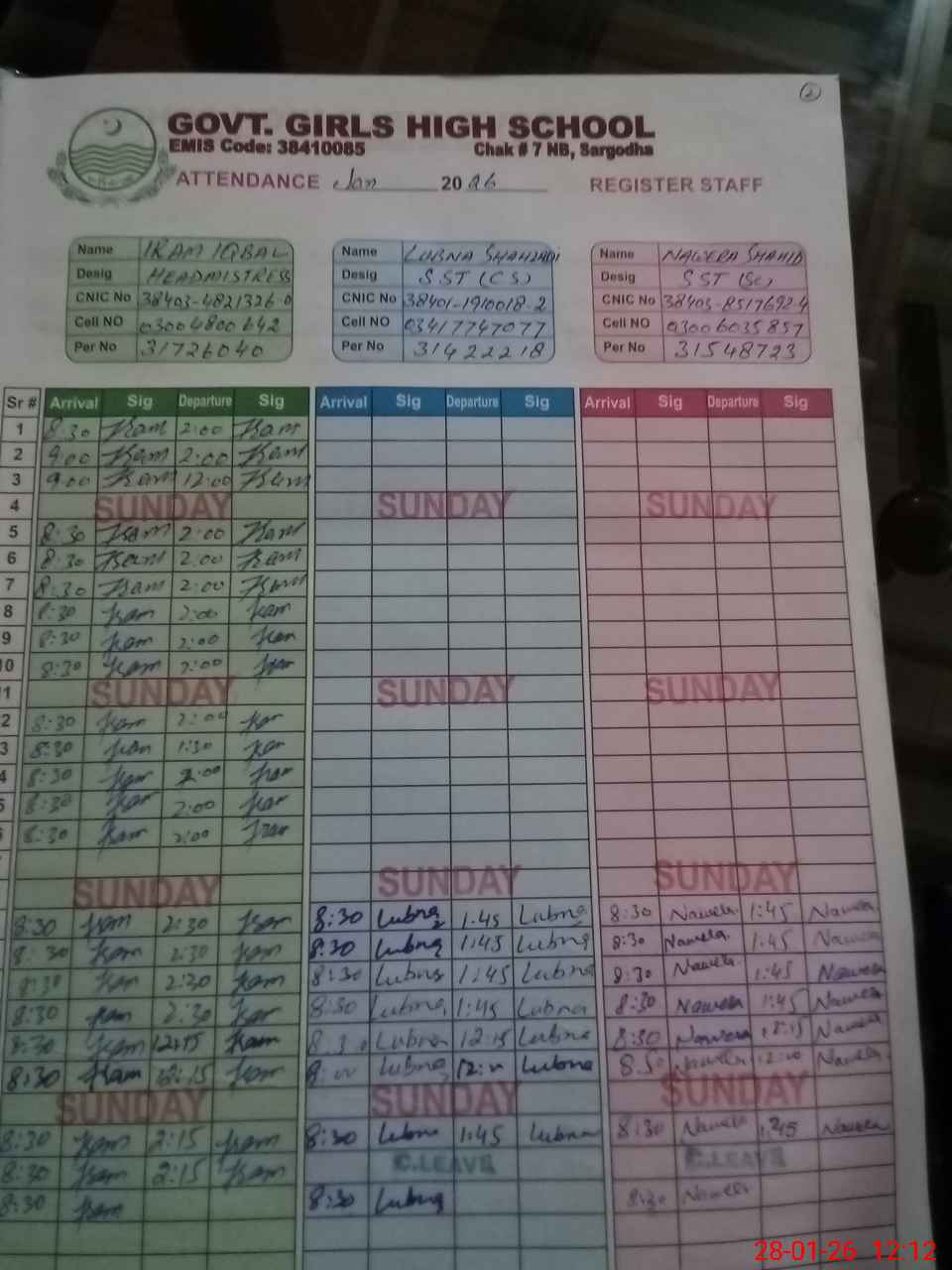 | CNIC | Full Name | Designation | R/C | Absence During Last Calender Month |
