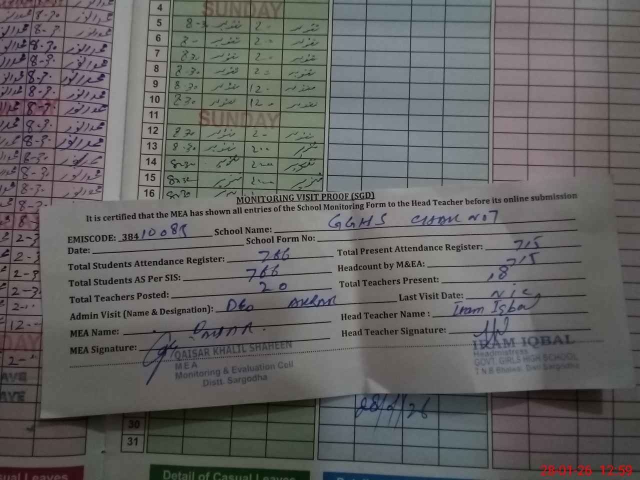 | Attendance Register | Head Teacher | MEA with School | Visit Proof |