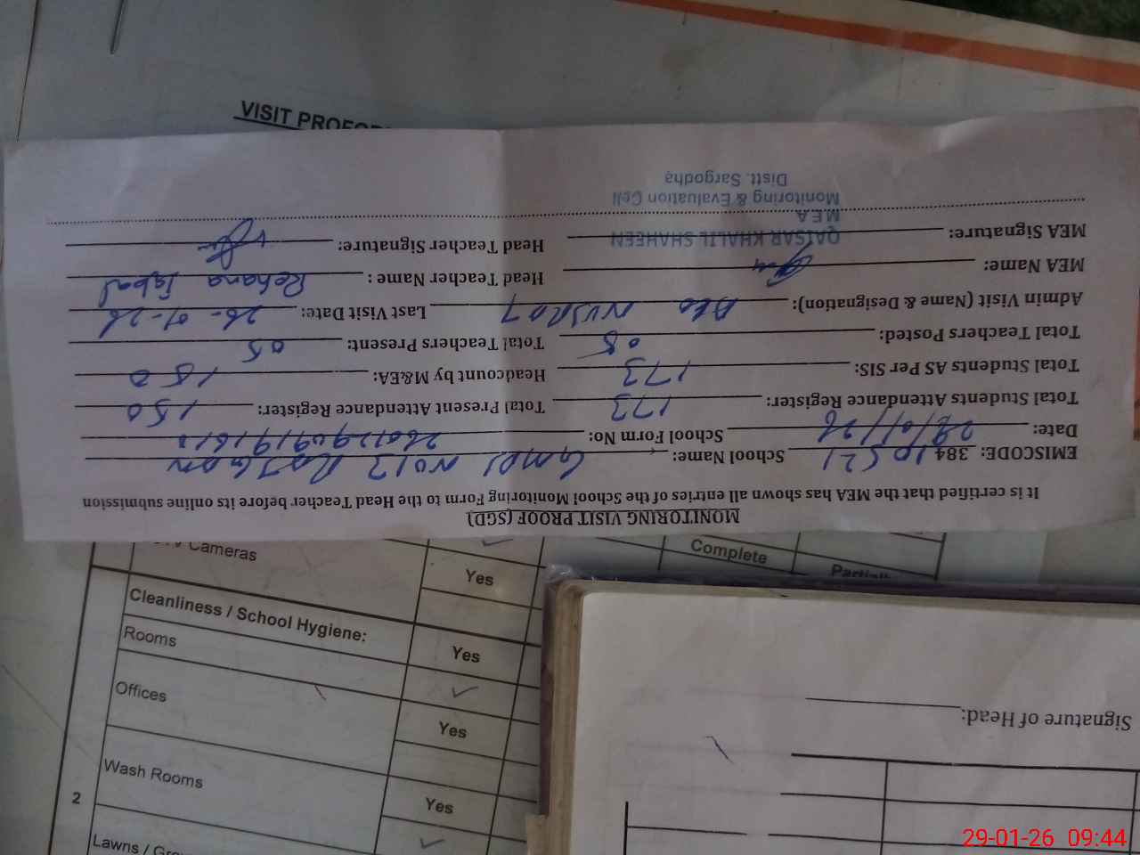 | Attendance Register | Head Teacher | MEA with School | Visit Proof |