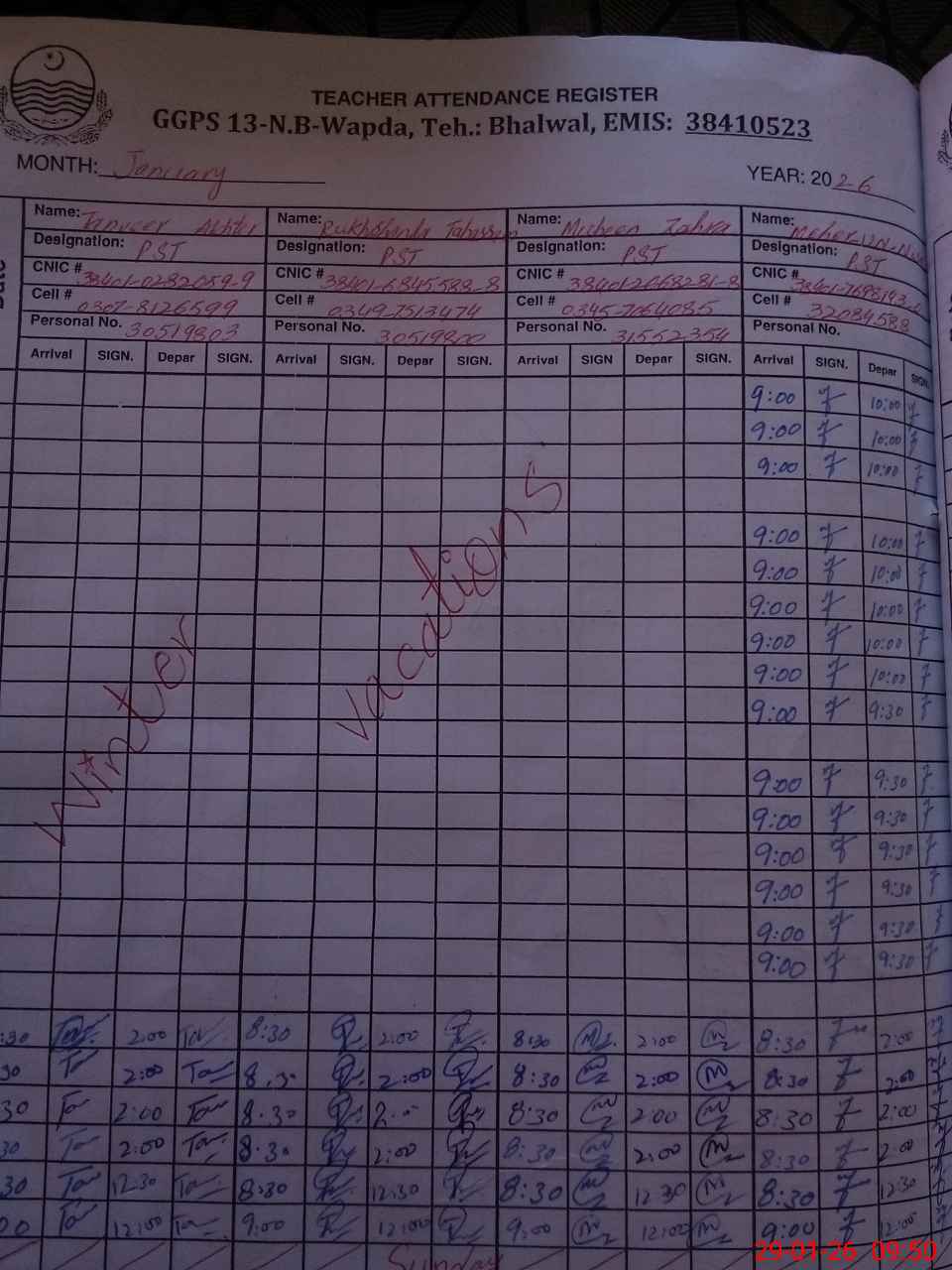 | CNIC | Full Name | Designation | R/C | Absence during last cal. month |