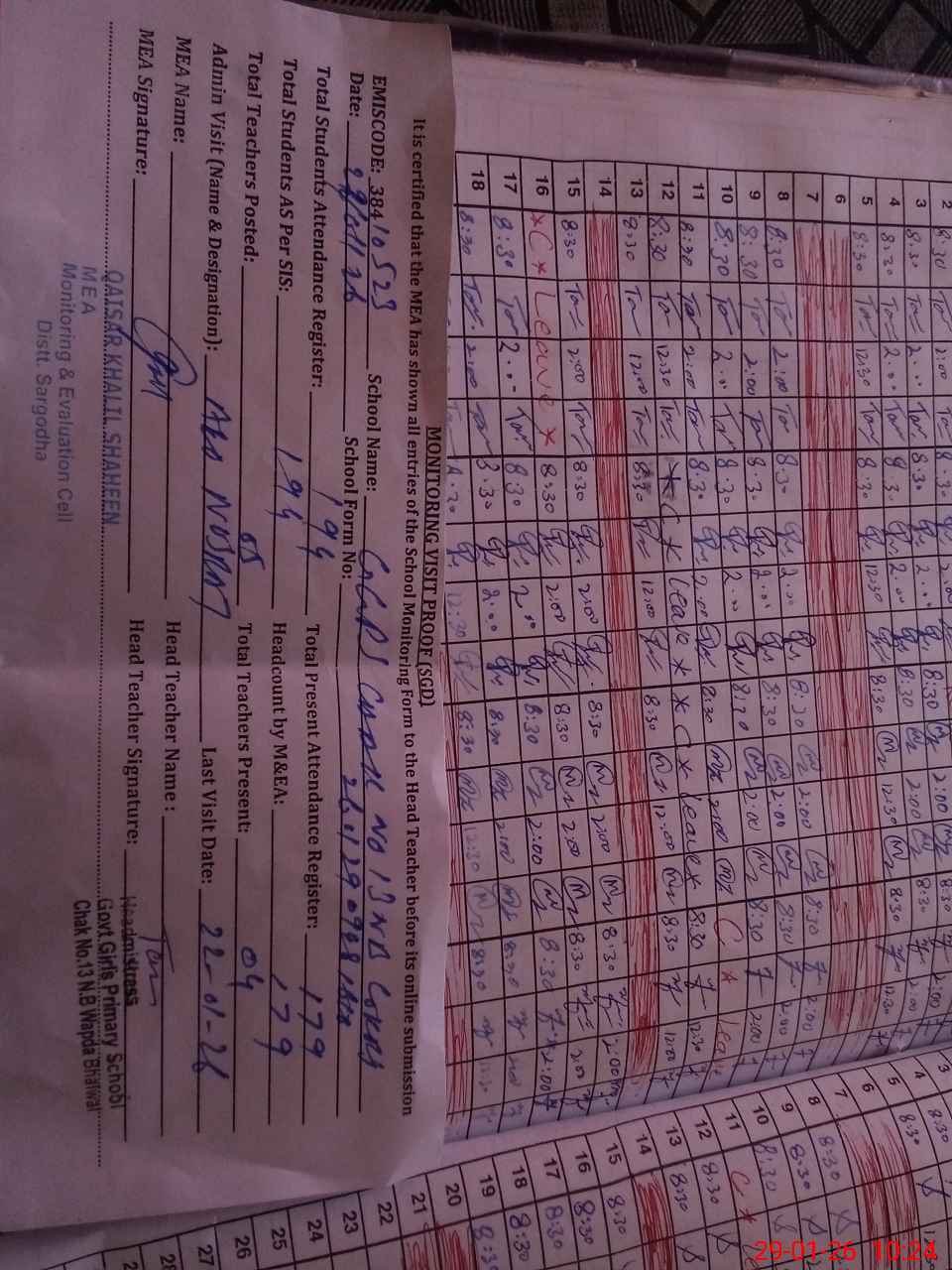 | Attendance Register | Head Teacher | MEA with School | Visit Proof |