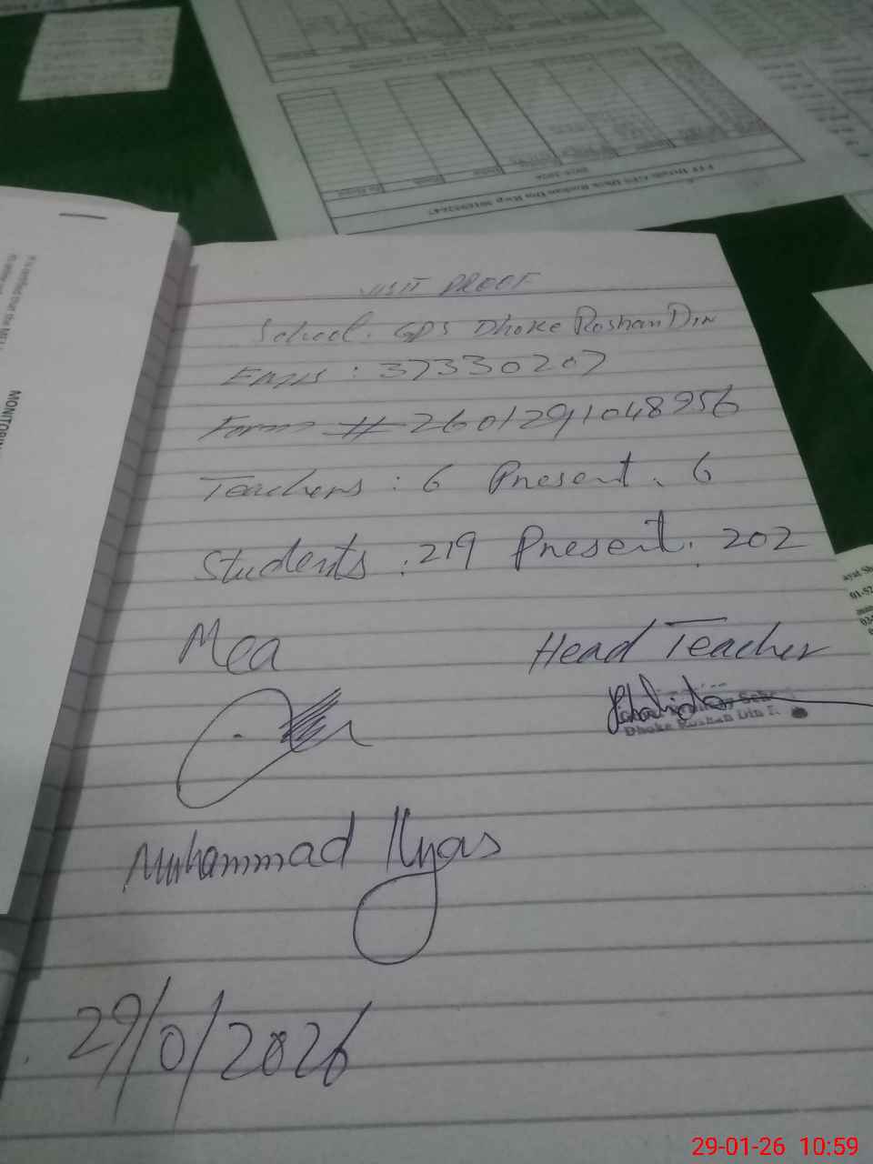 | Attendance Register | Head Teacher | MEA with School | Visit Proof |