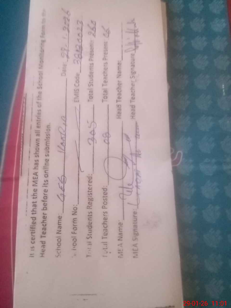 | Attendance Register | Head Teacher | MEA with School | Visit Proof |