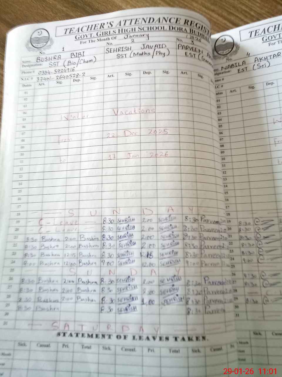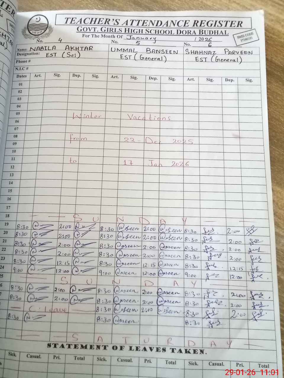 | CNIC | Full Name | Designation | R/C | Absence During Last Calender Month |