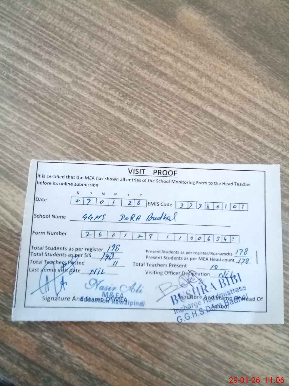 | Attendance Register | Head Teacher | MEA with School | Visit Proof |