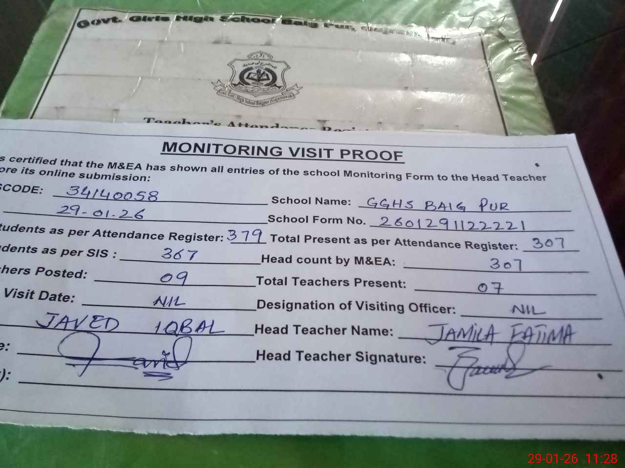 | Attendance Register | Head Teacher | MEA with School | Visit Proof |