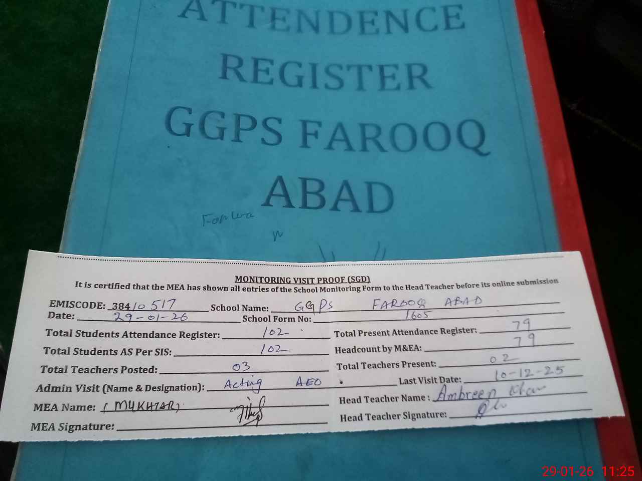 | Attendance Register | Head Teacher | MEA with School | Visit Proof |