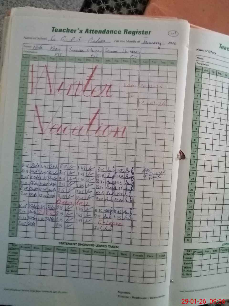 | Leave | Duty | Absent | Maternity | Medical | Ex- Pak |
