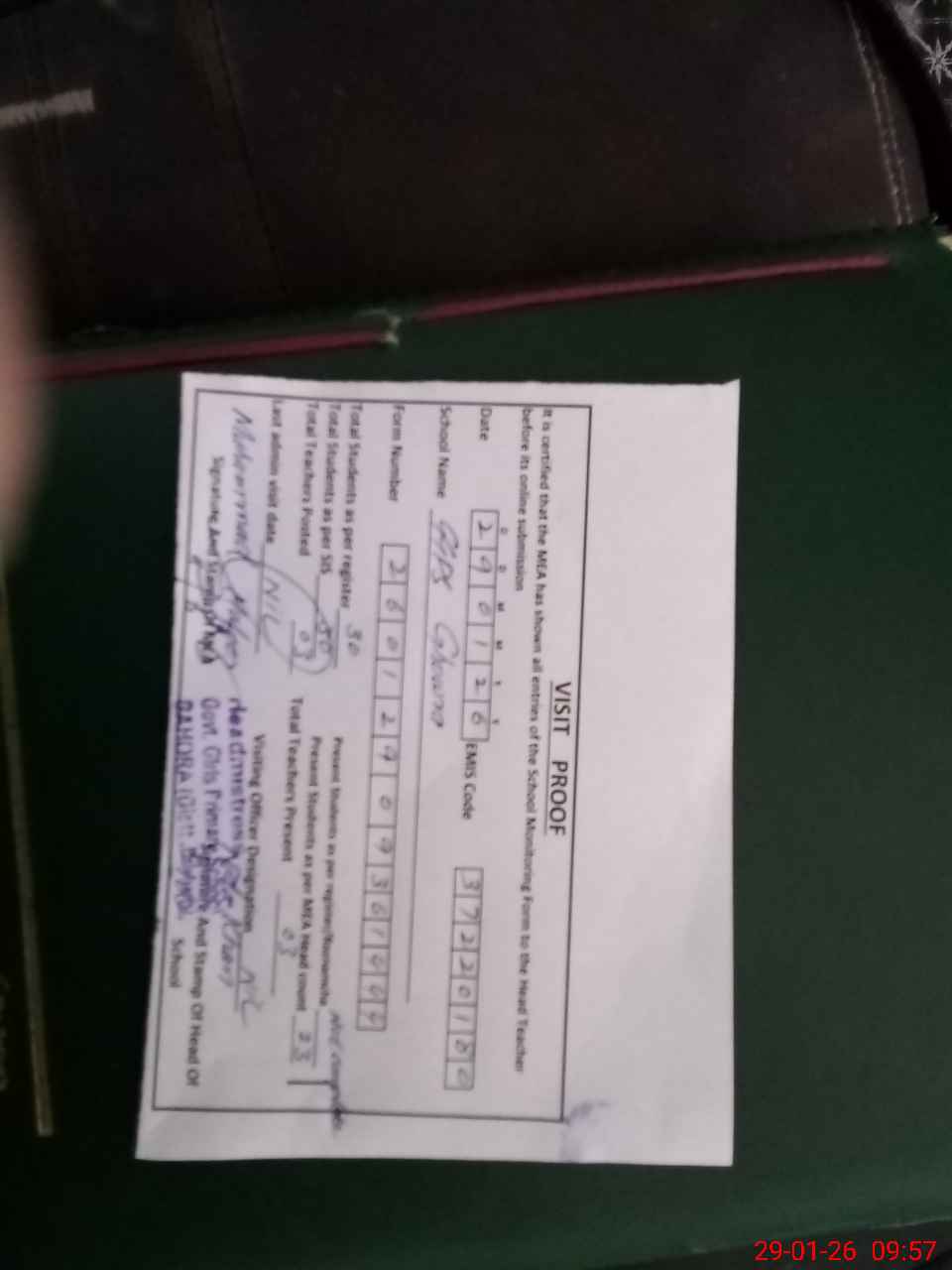 | Remarks (Use Separate Page if Required): Sir. I reached on schedule visit at 0930 hrs but attendance of students not complete and roznamacha also not complete picture are available. Cleaning of toilet poor. | |||||