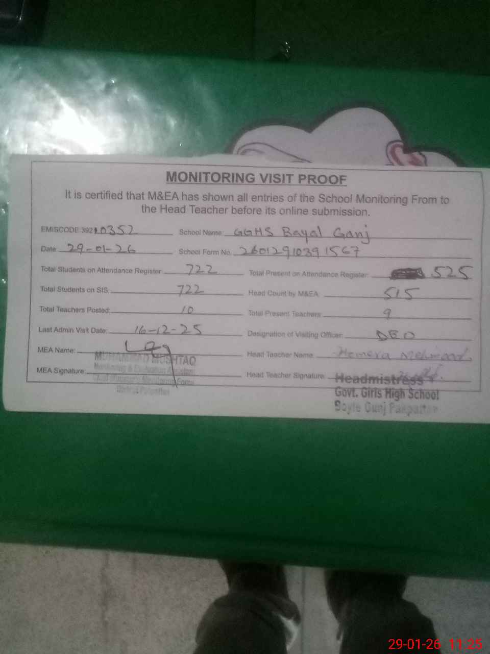 | Attendance Register | Head Teacher | MEA with School | Visit Proof |