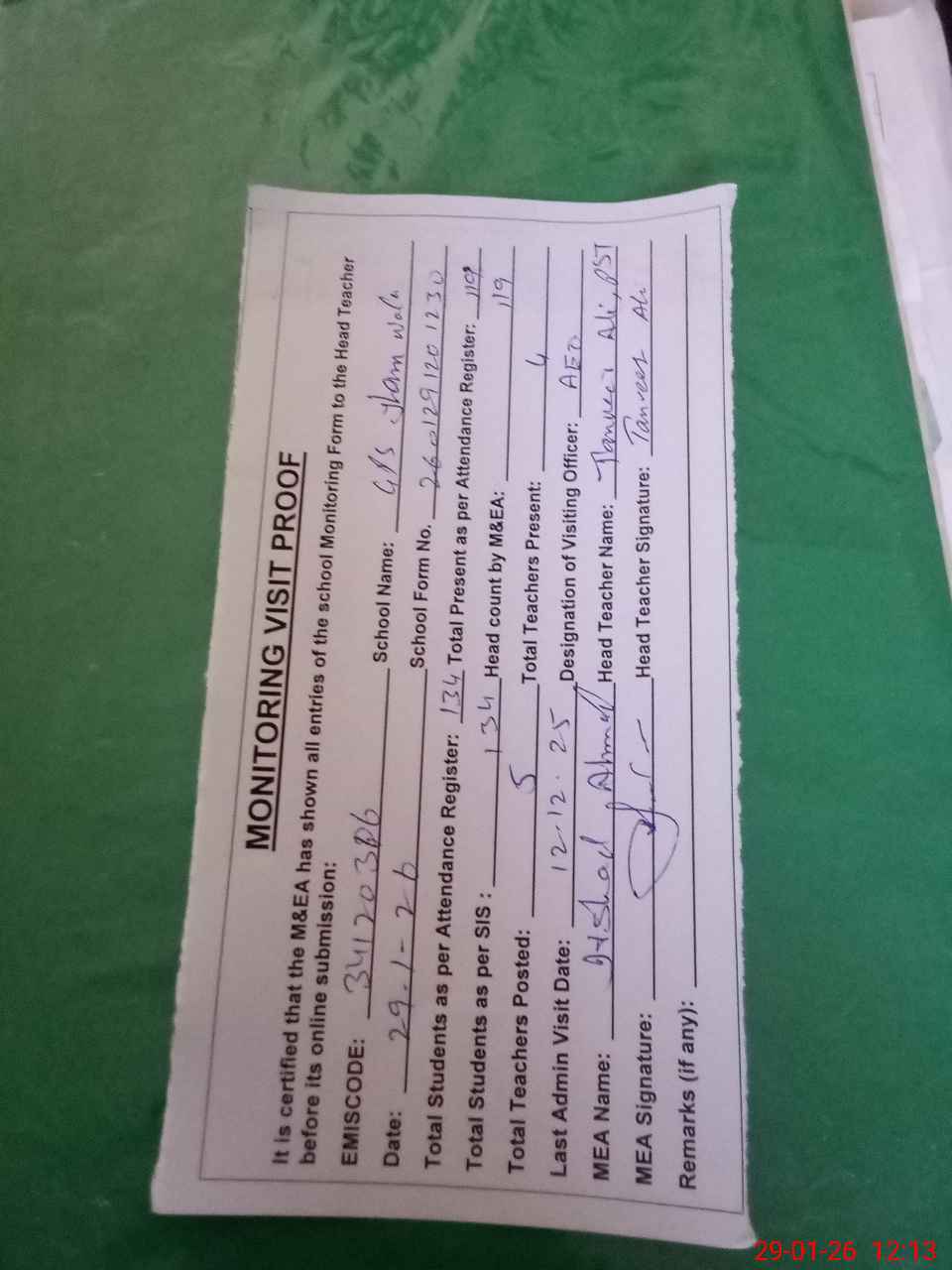 | Attendance Register | Head Teacher | MEA with School | Visit Proof |