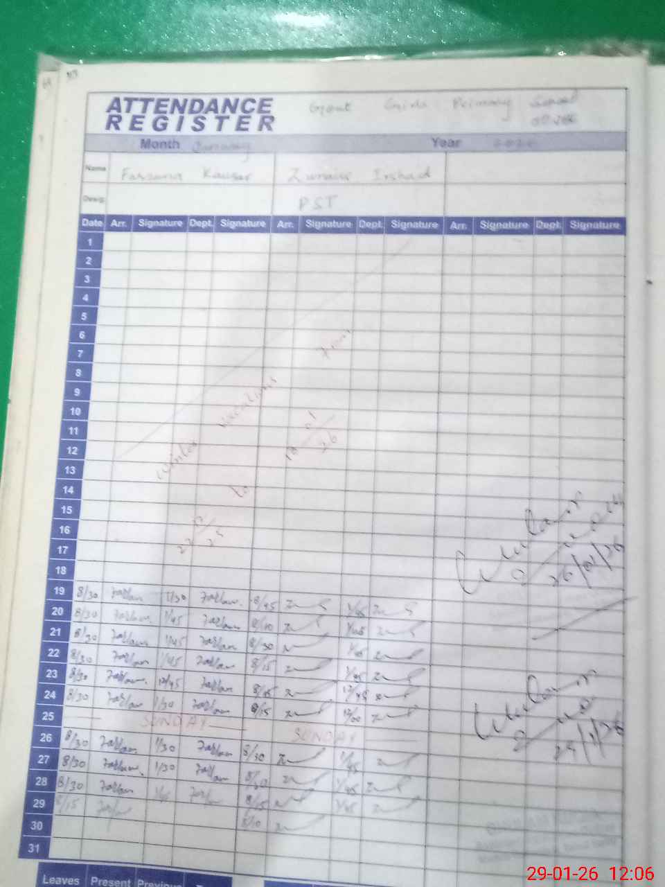 | CNIC | Full Name | Designation | R/C | Absence During Last Calender Month |