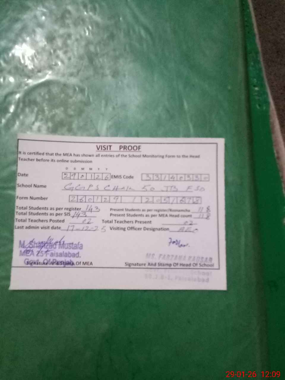| Attendance Register | Head Teacher | MEA with School | Visit Proof |