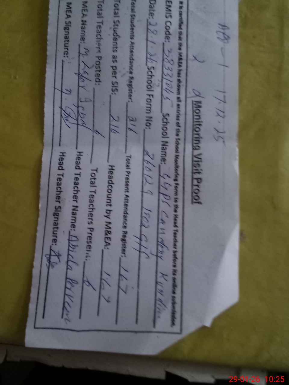 | Attendance Register | Head Teacher | MEA with School | Visit Proof |