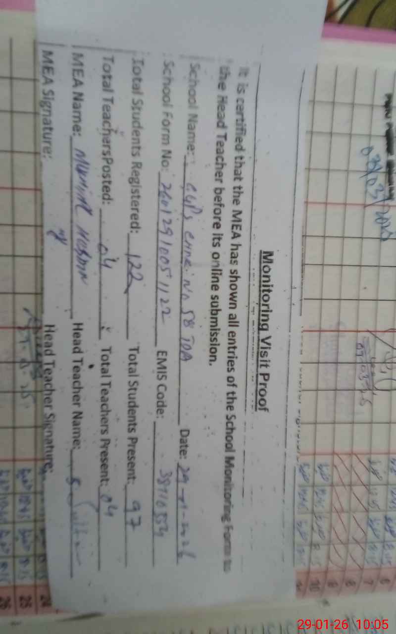 | Attendance Register | Head Teacher | MEA with School | Visit Proof |