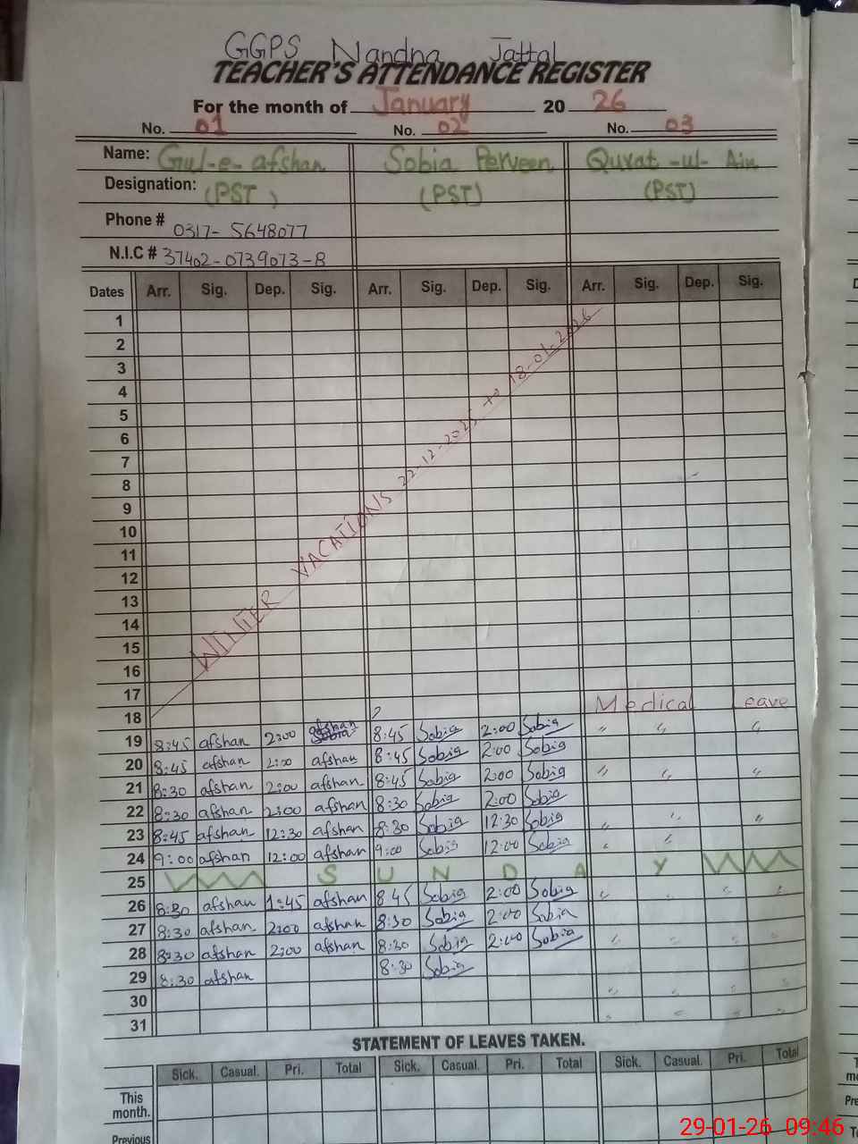 | CNIC | Full Name | Designation | R/C | Absence during last cal. month |