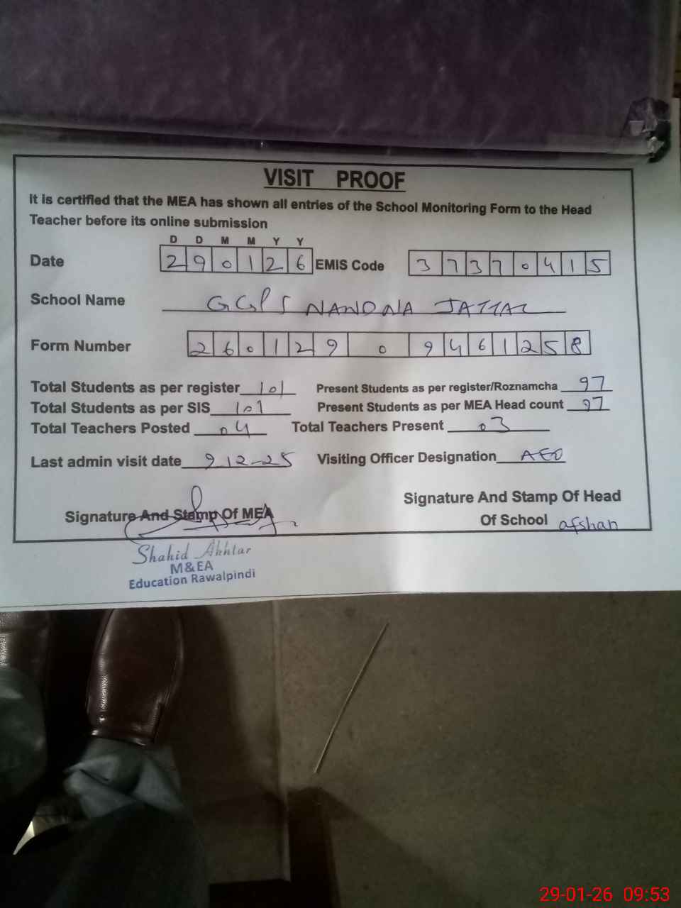 | Attendance Register | Head Teacher | MEA with School | Visit Proof |