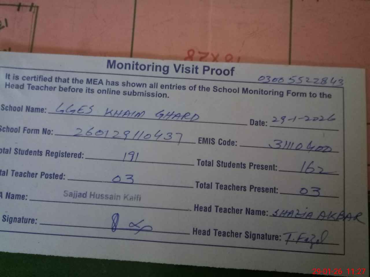 | Attendance Register | Head Teacher | MEA with School | Visit Proof |