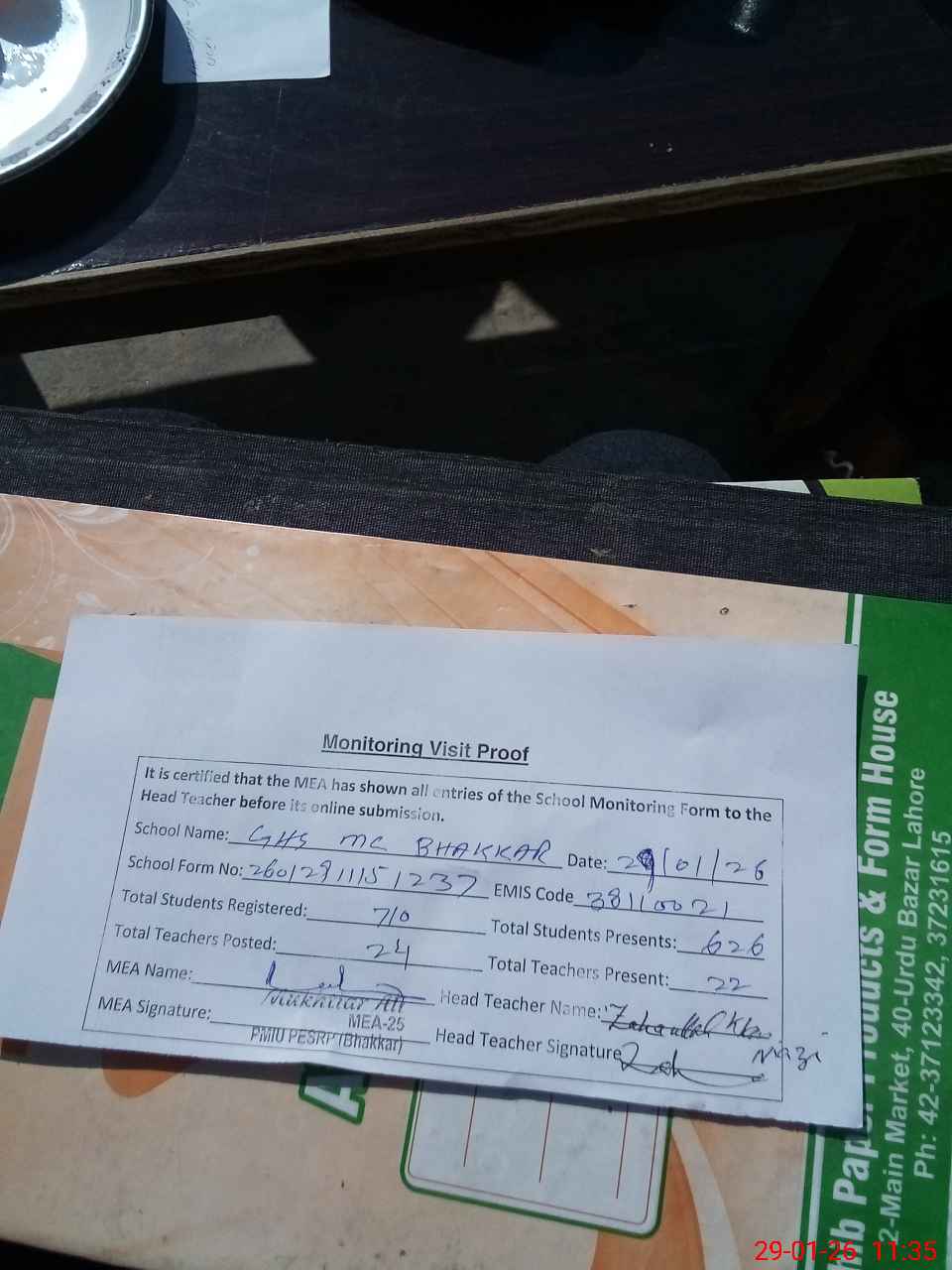 | Attendance Register | Head Teacher | MEA with School | Visit Proof |
