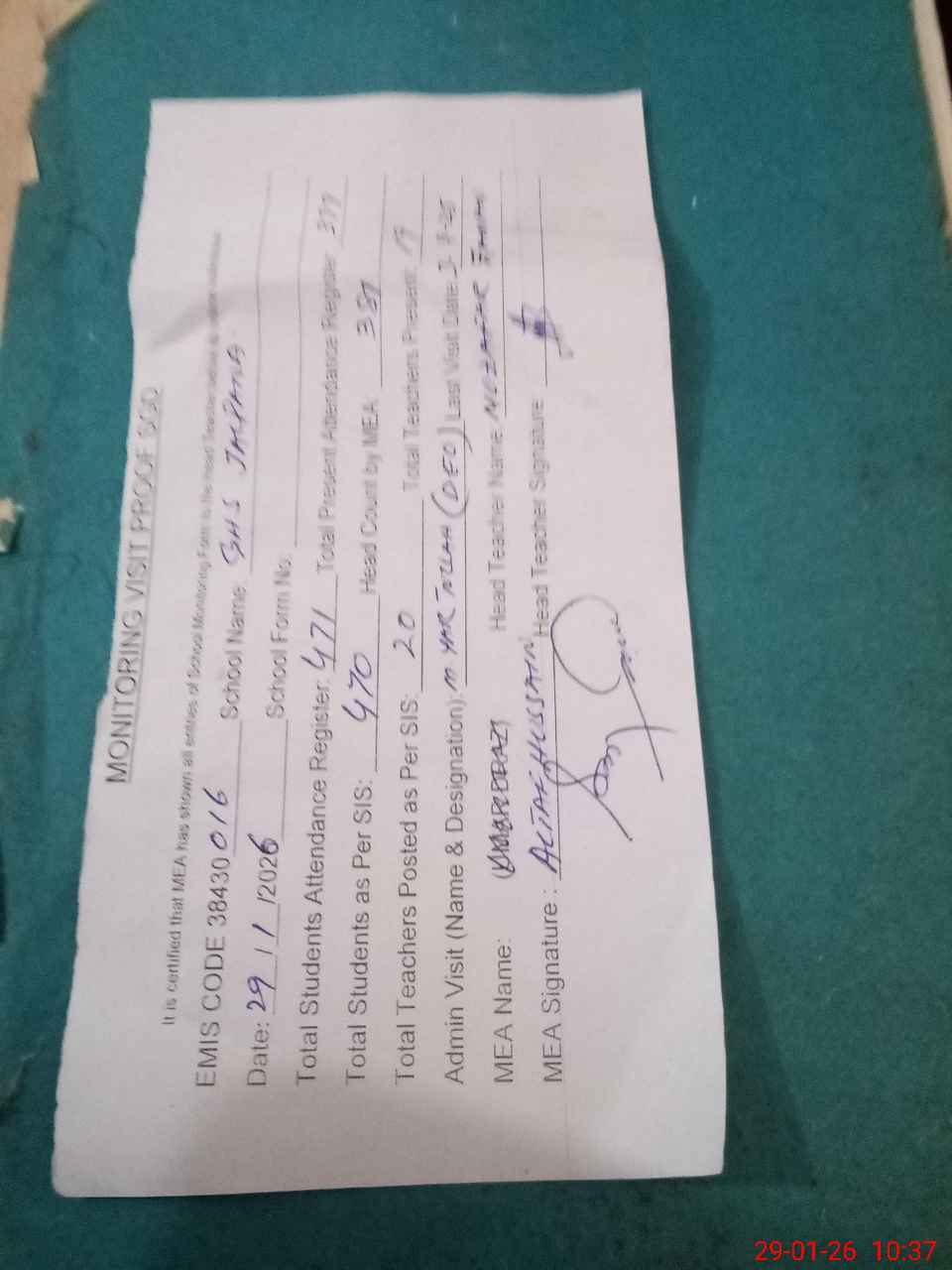 | Attendance Register | Head Teacher | MEA with School | Visit Proof |