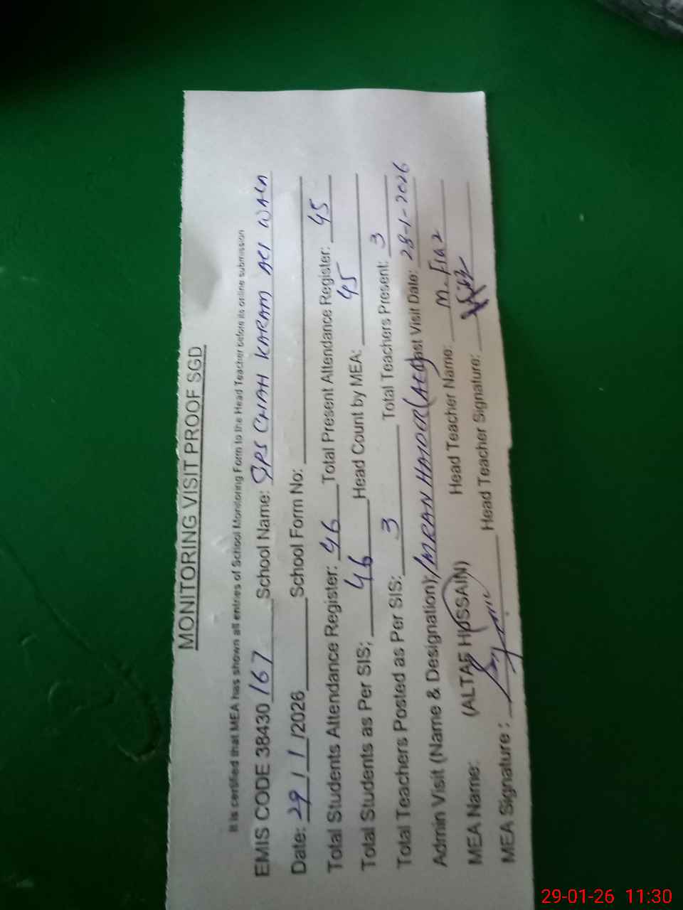 | Attendance Register | Head Teacher | MEA with School | Visit Proof |