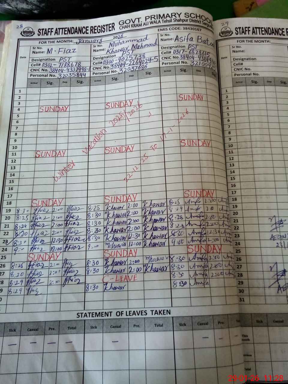 | CNIC | Full Name | Designation | R/C | Absence During Last Calender Month |