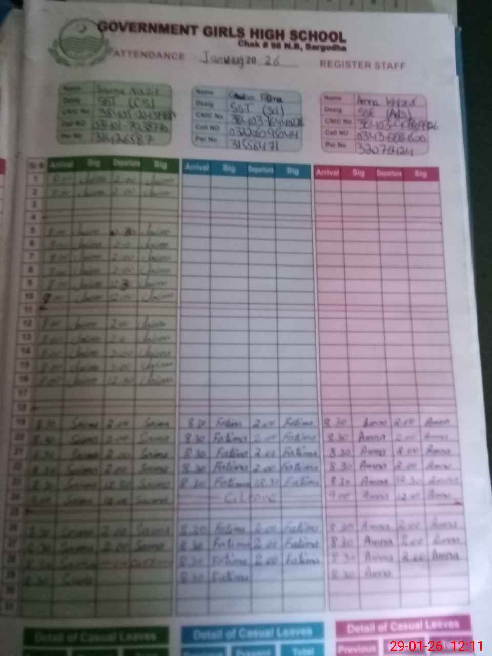 | CNIC | Full Name | Designation | R/C | Absence During Last Calender Month |