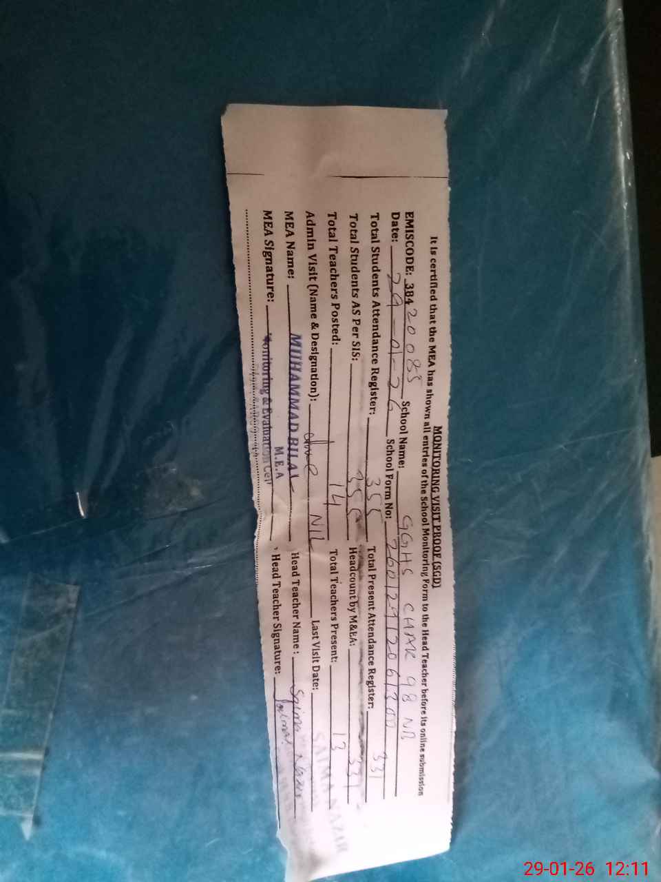 | Attendance Register | Head Teacher | MEA with School | Visit Proof |