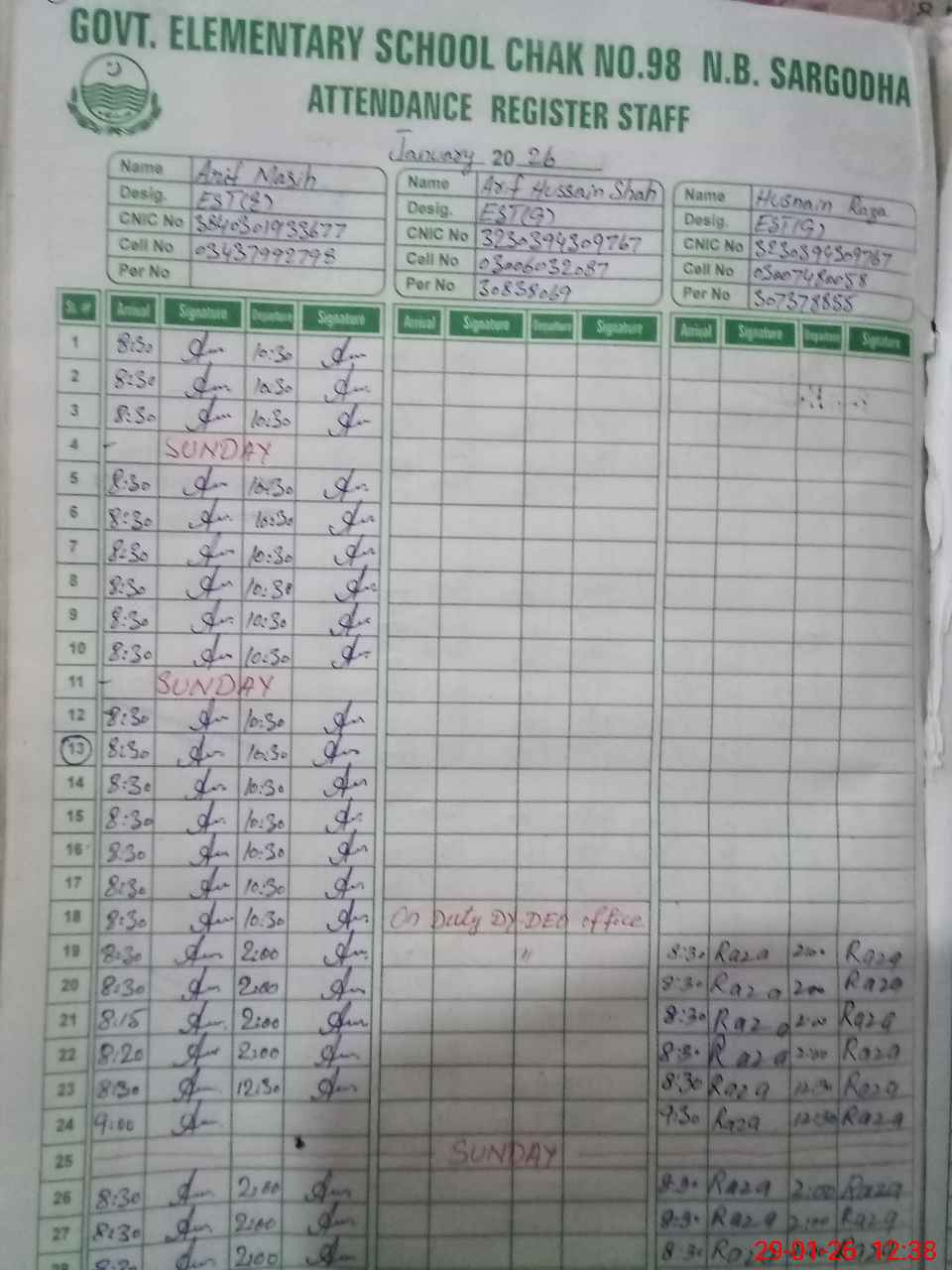 | CNIC | Full Name | Designation | R/C | Absence During Last Calender Month |