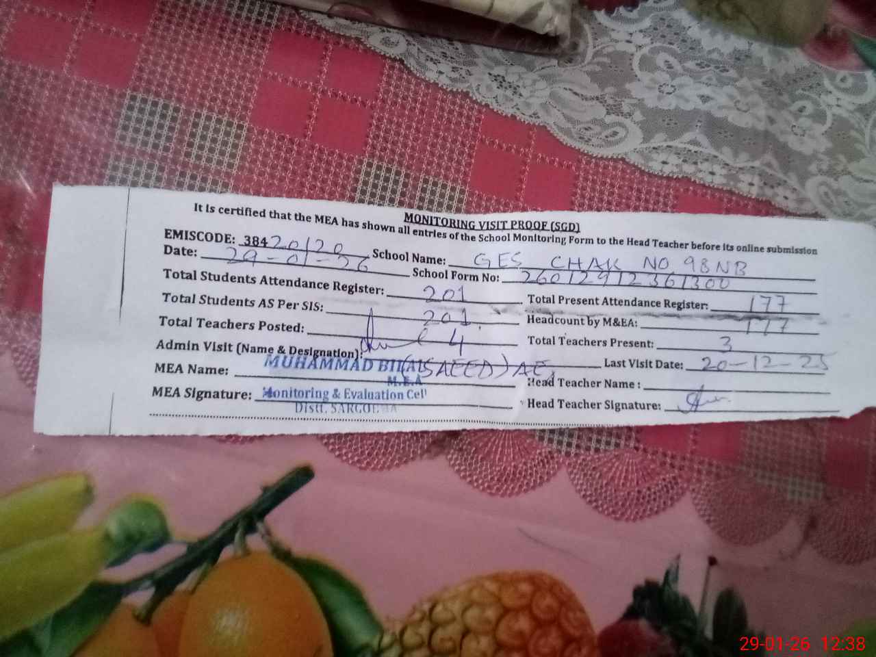 | Attendance Register | Head Teacher | MEA with School | Visit Proof |