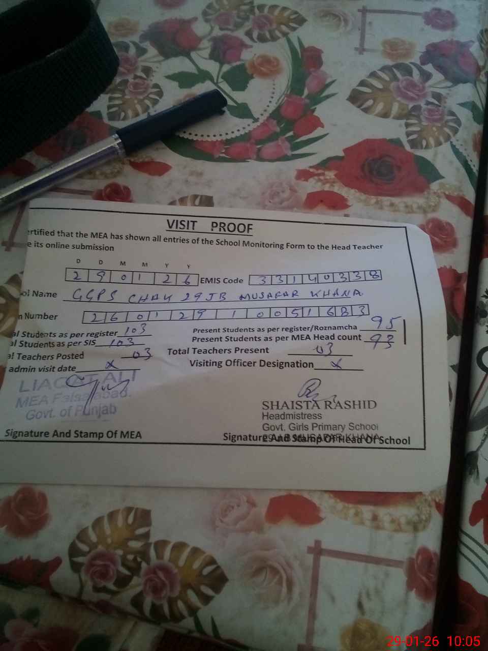 | Attendance Register | Head Teacher | MEA with School | Visit Proof |
