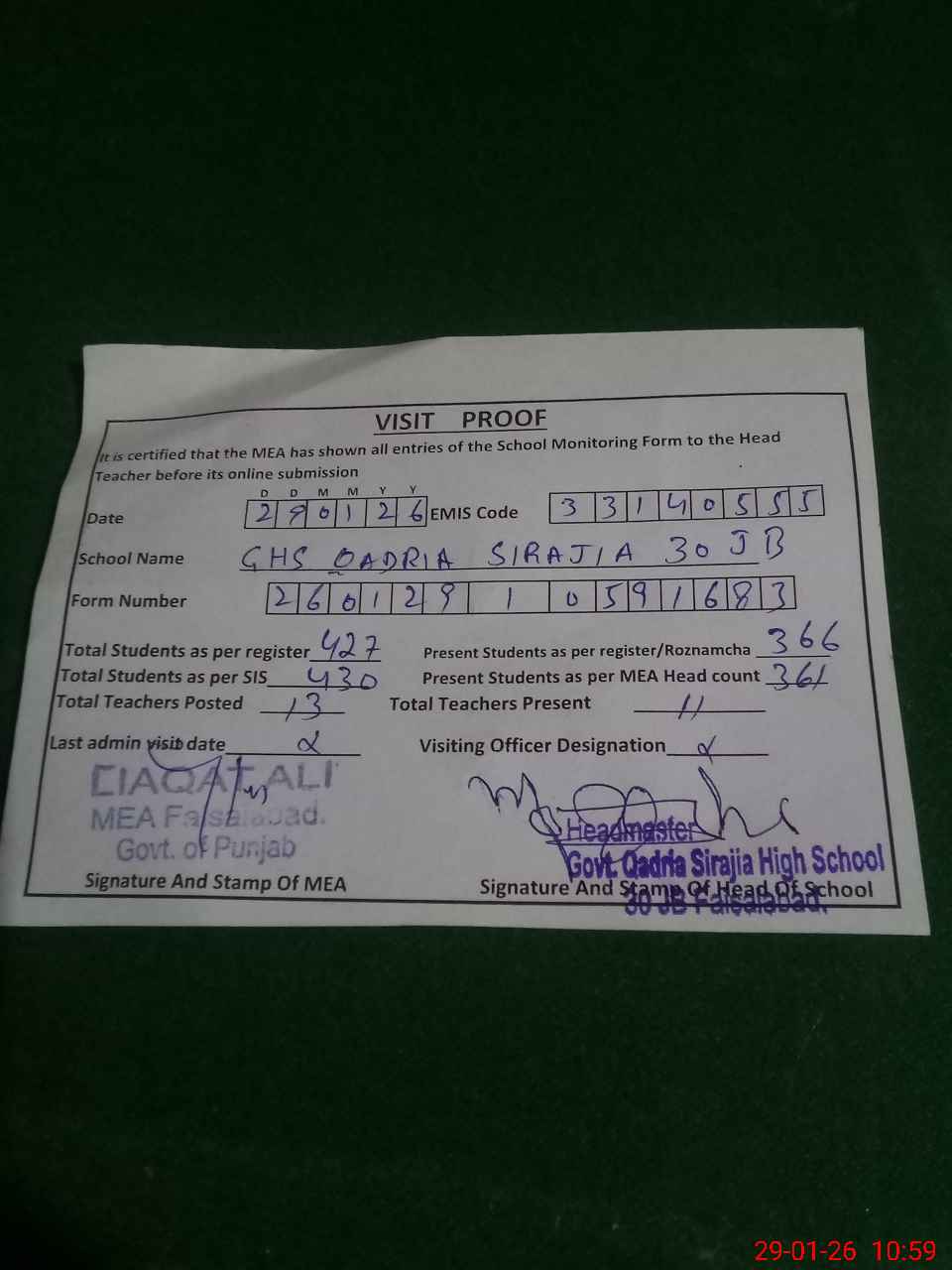| Attendance Register | Head Teacher | MEA with School | Visit Proof |