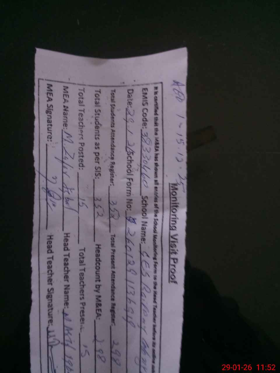 | Monitoring Date: 29-01-2026 | Start Time: 29-01-2026 11:18 AM | End Time: 29-01-2026 11:52 AM | Name of MEA: Mu**** Za**** Iq**** | |