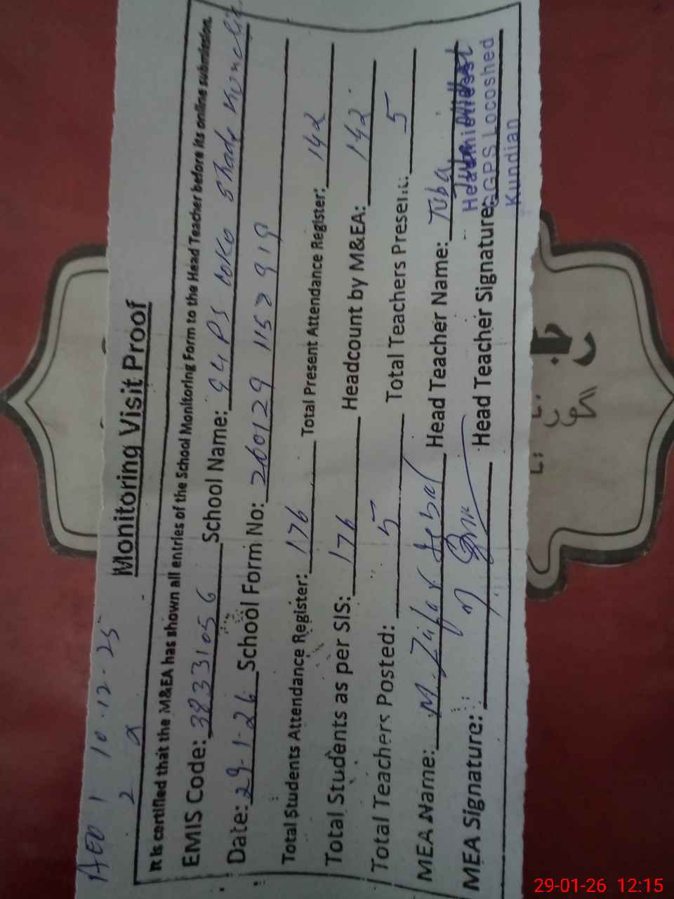 | Attendance Register | Head Teacher | MEA with School | Visit Proof |