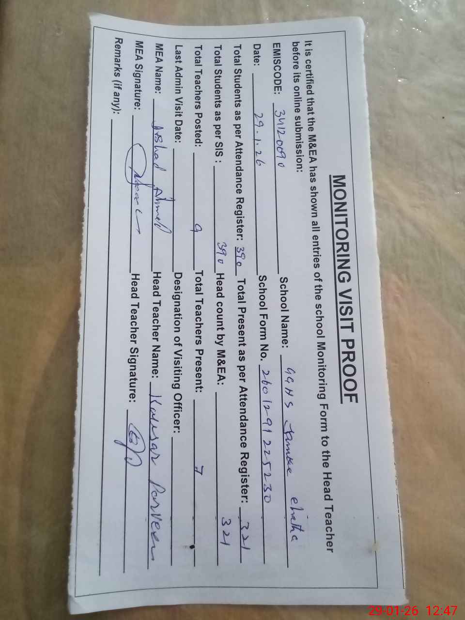 | Attendance Register | Head Teacher | MEA with School | Visit Proof |