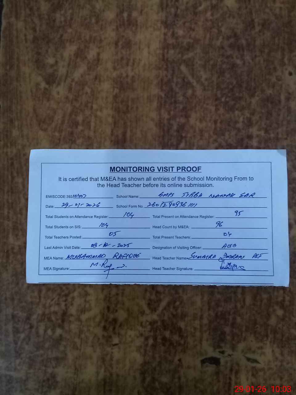 | Attendance Register | Head Teacher | MEA with School | Visit Proof |