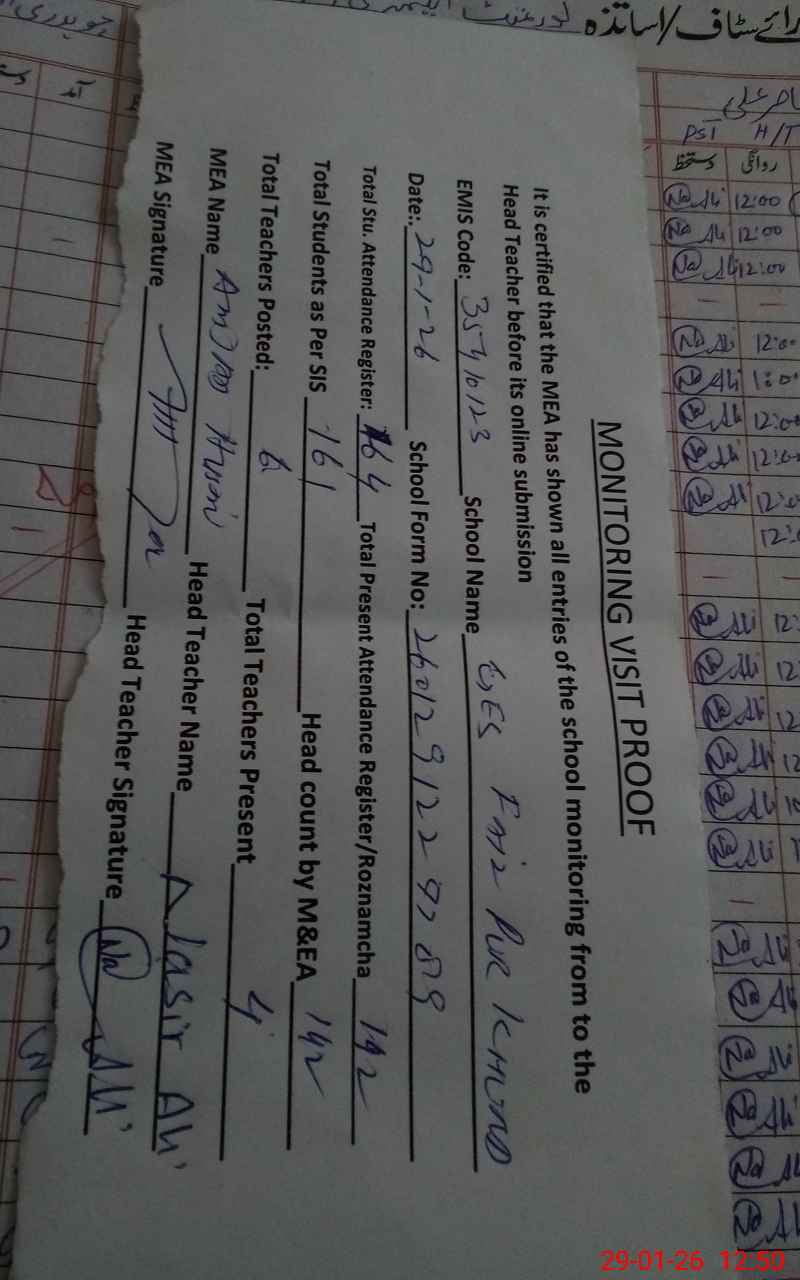| Attendance Register | Head Teacher | MEA with School | Visit Proof |
