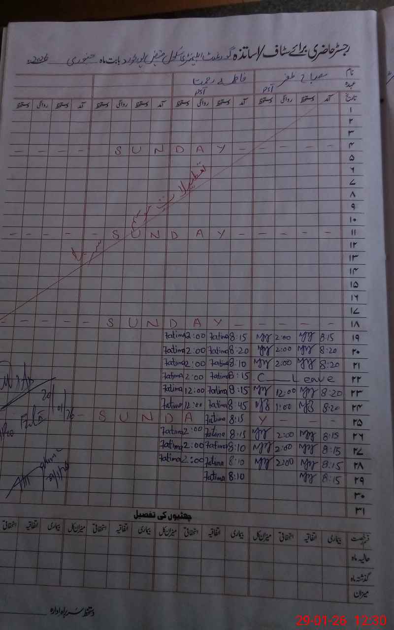 | CNIC | Full Name | Designation | R/C | Absence During Last Calender Month |