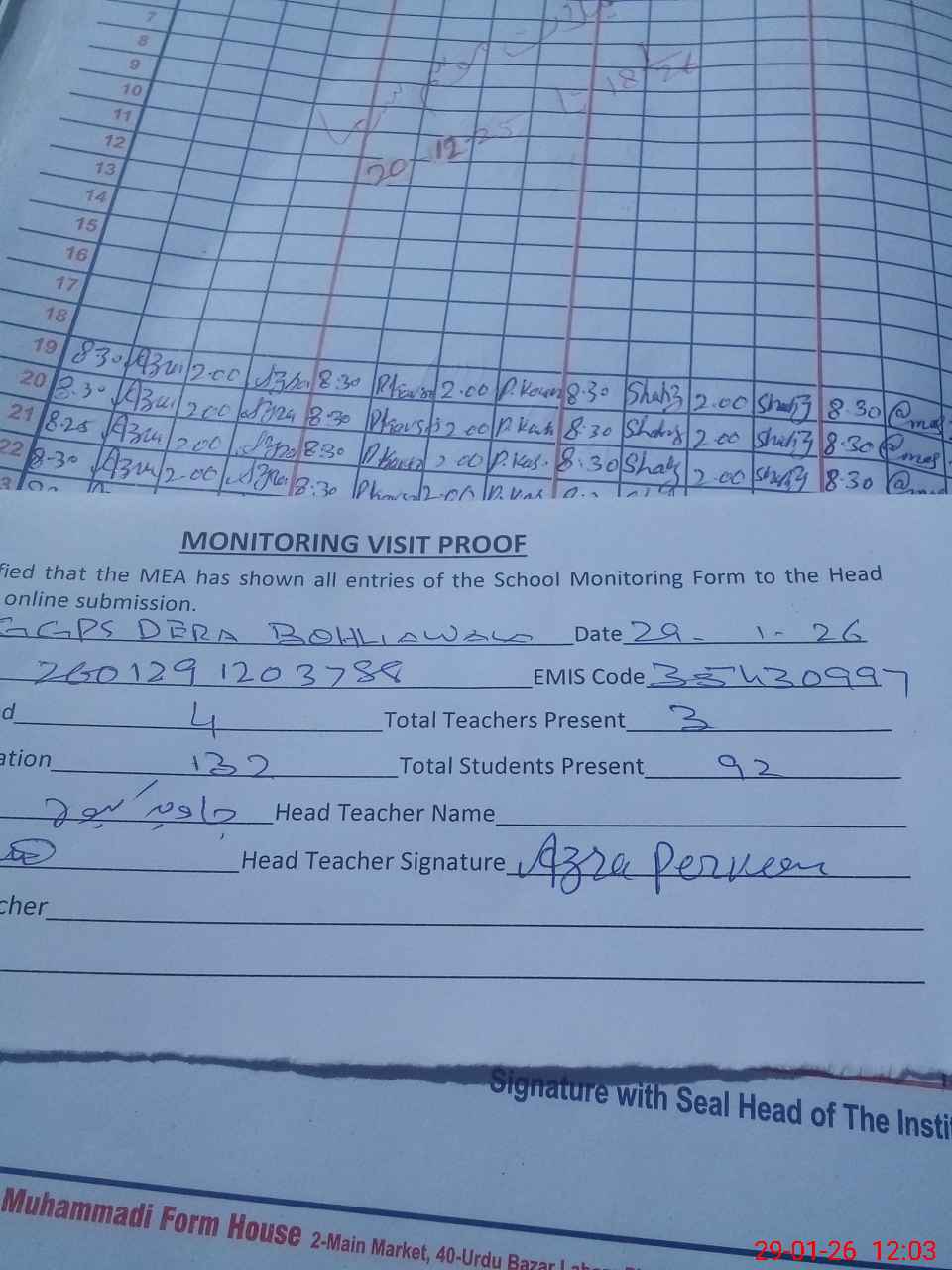| Attendance Register | Head Teacher | MEA with School | Visit Proof |